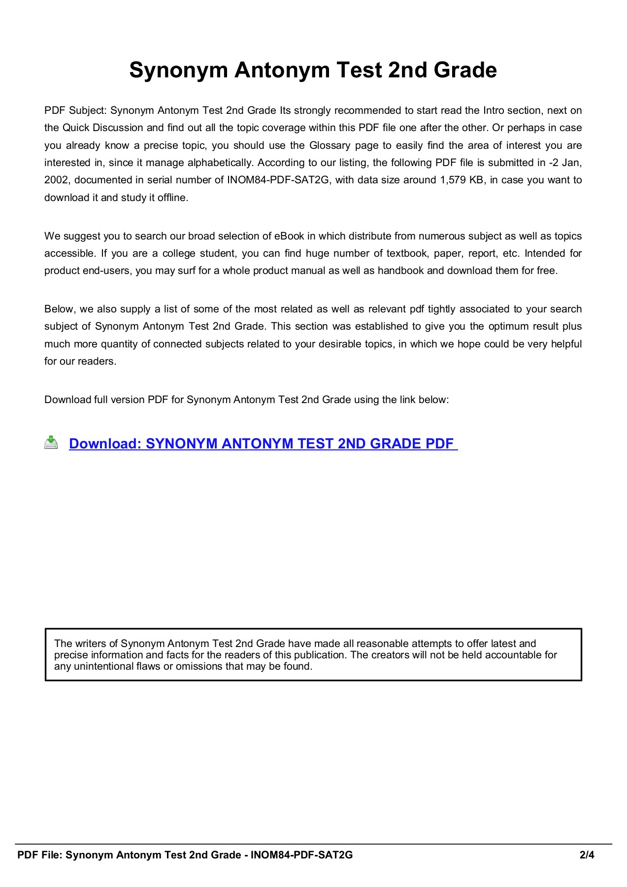 Synonym Antonym Test 2nd Grade Inom84 Pdf Sat2g